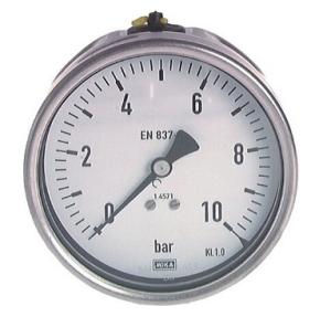 Manomètre avec échelle 0/10 bar. Remplissage glycérine. Mod. 233-50 WIKA Ø63 DN38 RARCl. 1.6. Raccord arrière centré. Remplissage glycérine. Monté sur séparateur 990.53/DN38