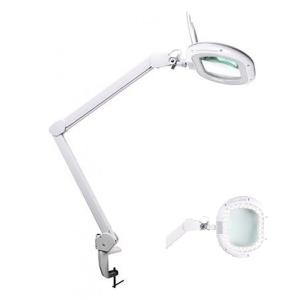 Lampe loupe articulée de bureau, avec éclairage par 60 Leds HQ à intensité réglable (de 3500°K à 6400 °K) et dotée d'une lentille (140 x 105 mm) en verre minéral biconvexe, assurant un grossissement 2,25x (5 dioptries).