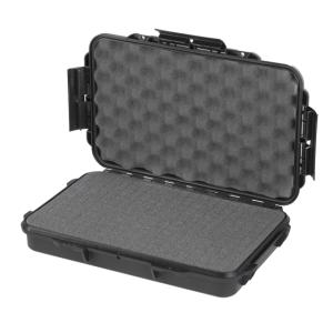 Boite étanche équipée de trois plaques de mousse amovibles. L'une, alvéolée (épaisseur de 15 mm) sur la partie supérieure et deux autres dont une pré-découpée en cube (épaisseur de 25 mm chaque) pour la partie inférieure et une dernière (plane de 10 mm) permettant ainsi d'assurer le calage adéquat des objets dans l'espace dédié.