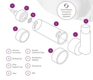 • Le DUSA pour MDI se compose d'un tube de prélèvement d'échantillons, d'un filtre pour capturer la dose délivrée et d'un connecteur pour connecter le DUSA à la configuration de test plus large. Il a été conçu pour améliorer la productivité et garantir une facilité d'utilisation.