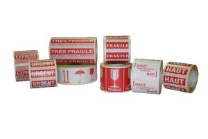Etiquette adhésive de marquage "Fragile" + symbole du verre. Ecriture blanche sur fond rouge, Dim.: 105 x 73 mm. Présentation en rouleau sur mandrin de 1000 étiquettes.